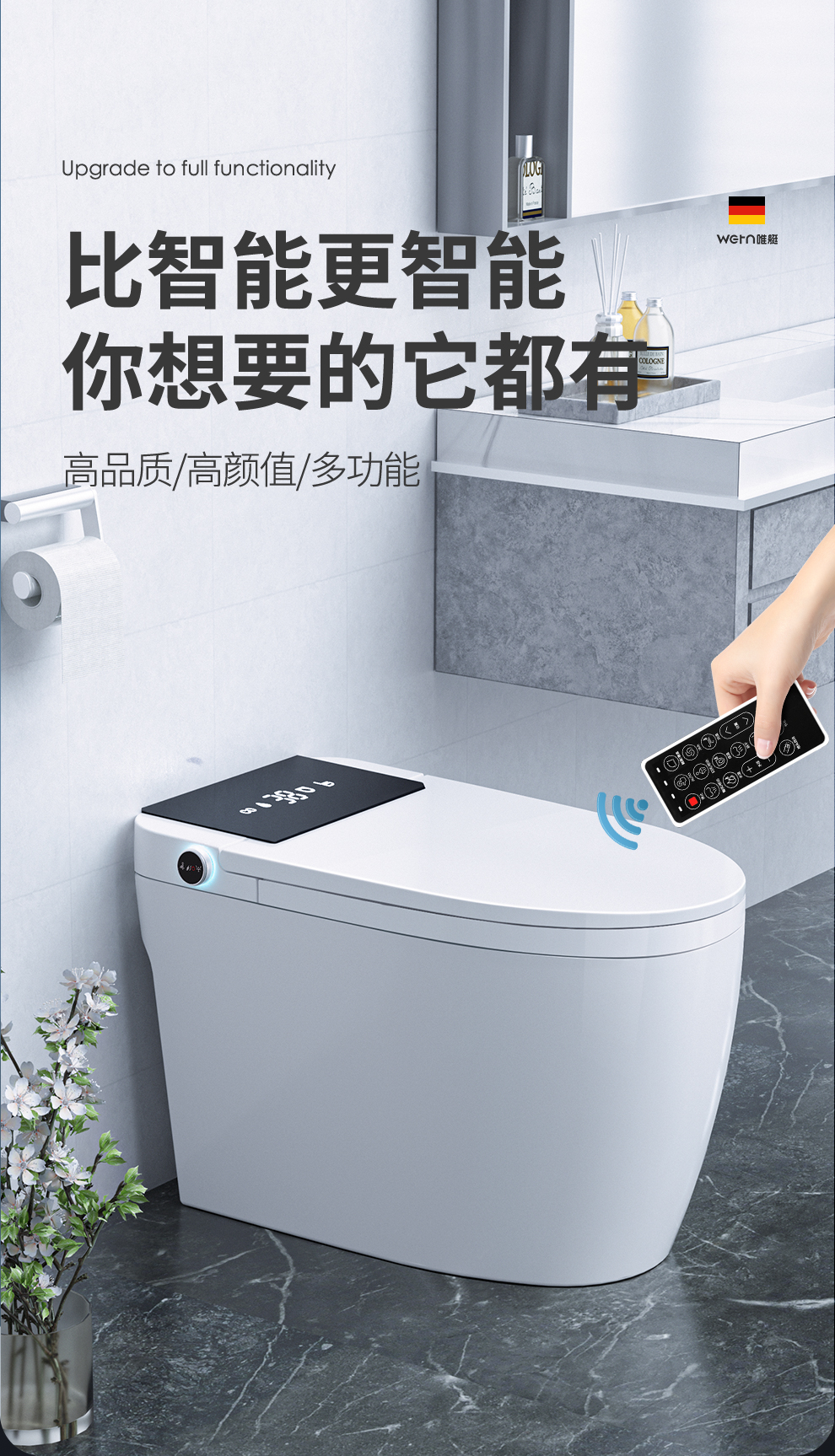 唯艇 德国(WETN)智能马桶一体式机无水压限制坐便器全自动翻盖清洗加热烘干座便器 945A标准版