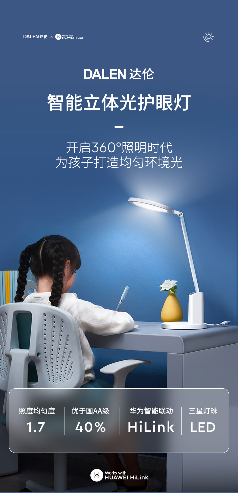 商品名称:达伦智能护眼台灯国AA级无蓝光危害儿童学生读写台灯学习阅读灯3D立体光 HUAWEI HiLink生态产品 DL-31W